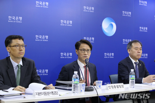 【서울=뉴시스】박미소 수습기자 = 변성식(가운데) 안정총괄팀장이 28일 오전 서울 중구 한국은행 기자실에서 열린 '금융안정상황 2019년 3월' 기자설명회에서 발언하고 있다. 2019.03.28.