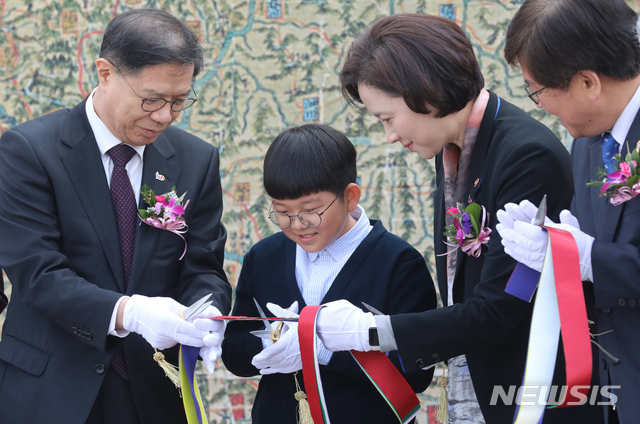 【세종=뉴시스】강종민 기자 = 유은혜 부총리 겸 교육부 장관과 김도형 동북아역사재단이사장 등이 28일 오전 세종시 어진동 국립세종도서관에서 열린 동해·독도 지도展 개막식에서 어린이 참석자의 축하테잎 절단을 돕고 있다.