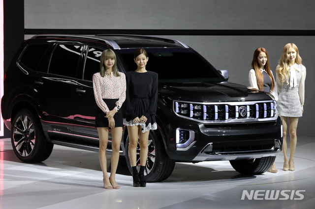 【고양=뉴시스】이윤청 수습기자 = 걸그룹 블랙핑크가 28일 경기 고양 킨텍스에서 열린 2019 서울모터쇼 미디어데이에서 기아자동차 모하비 마스터피스를 선보이고 있다.
