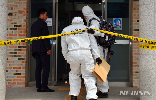 【화순=뉴시스】변재훈 기자 = 28일 오전 11시24분께 전남 화순군 북면 보건지소에서 A(52)씨가 전 아내 B(54·여)씨를 흉기로 찌른 뒤 자해해 2명 모두 숨졌다. 이날 경찰 과학수사팀이 현장 감식을 위해 보건지소 안으로 들어가고 있다. 2019.03.28.
