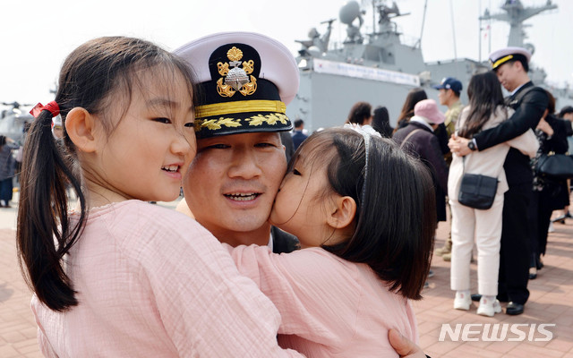 【부산=뉴시스】 하경민 기자 = 29일 오전 부산 남구 해군작전사령부 부산작전기지 부두에서 청해부대원이 가족과 작별인사를 하고 있다.