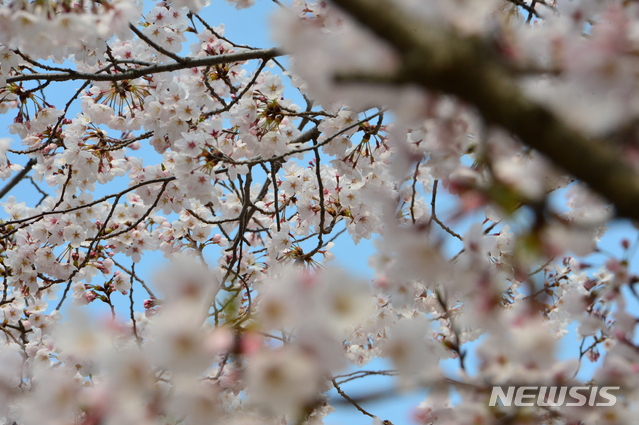 【창원=뉴시스】김기진 기자 =30일 경남 창원시 진해구에 위치한 '경화역(폐역)'에 피어 있는 벚꽃 사이로 푸른 하늘이 보이고 있다. 4월1일부터 진해 군항제가 공식 개막한다. 2019.03.30.