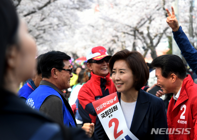 【통영=뉴시스】차용현 기자 = 4.3 국회의원 보궐선거 지원유세에 나선 자유한국당 나경원 원내대표가 30일 오후 경남 통영시 봉숫골 벚꽃축제장을 찾아 정점식 후보의 지지를 호소하고 있다. 2019.03.30.