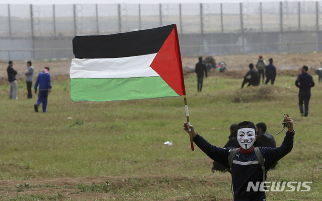 【가자=AP/뉴시스】이스라엘과 가자지구 국경지대에서 30일(현지시간) 가면을 쓴 한 시위자가 팔레스타인 국기를 흔들고 있다. 가자지구 봉쇄 해제를 요구하는 이날 시위에는 팔레스타인 시민 약 3만명이 참가했다. 2019.03.31.