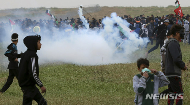 【가자=AP/뉴시스】30일(현지시간) 가자 국경에서 팔레스타인 시위대가 이스라엘군이 쏜 최루가스를 피해 달리고 있다. 이스라엘과 이집트의 가자 봉쇄조치에 항의하며 열린 이날 시위에는 총 4만여명이 참가했다. 2019.03.31.