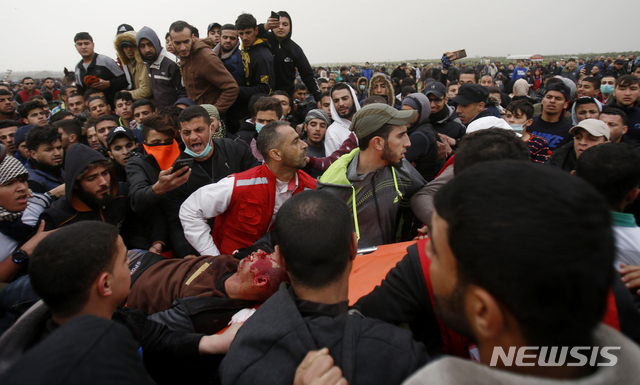【가자=AP/뉴시스】30일(현지시간) 가자 국경에서 열린 대규모 시위 도중 의료진과 시위대가 심각하게 부상을 입은 시위 참가자를 긴급 후송하고 있다. 이 참가자는 이후 숨졌다. 이스라엘과 이집트의 가자 봉쇄조치에 항의하며 열린 이날 시위에는 총 4만여명의 팔레스타인 시민들이 참가했다. 2019.03.31.