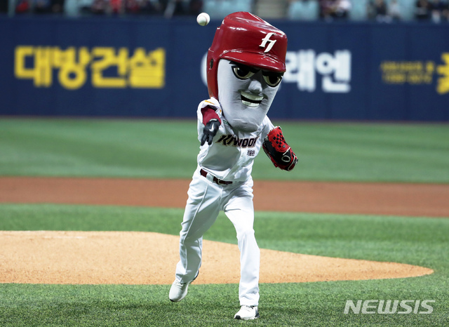 【서울=뉴시스】이윤청 수습기자 = 31일 오후 서울 구로구 고척스카이돔에서 열린 2019 KBO리그 키움 히어로즈와 SK 와이번스의 경기, 키움 히어로즈의 마스코트 '턱돌이'가 시구하고 있다. 2019.03.31.