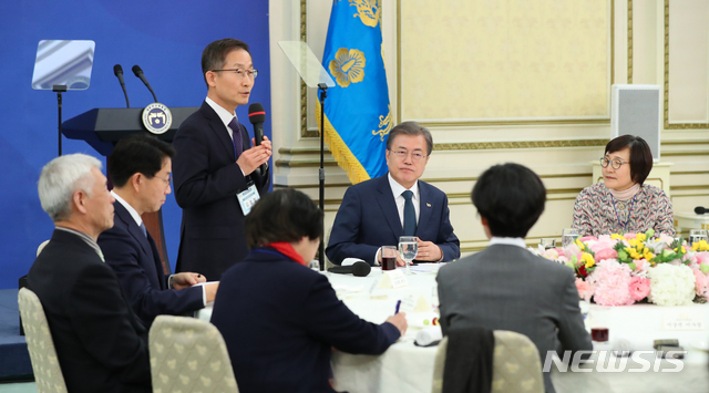 【서울=뉴시스】전신 기자 = 문재인 대통령이 1일 청와대 영빈관에서 열린 시민사회단체 초청 간담회에서 김호철 민주사회를 위한 변호사모임 회장의 권력기관 개혁 관련 발언을 듣고 있다. 2019.04.01.