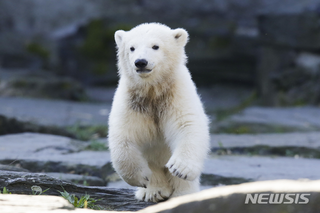 【베를린=AP/뉴시스】2일(현지시간) 독일 베를린의 티에르파크 동물원에서 새끼 북극곰 '헤르타'가 우리 안에서 뛰어놀고 있다.