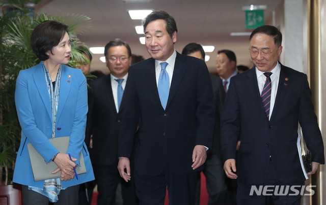 왼쪽부터 유은혜 사회부총리 겸 교육부 장관, 이 총리, 홍남기 경제부총리 겸 기획재정부 장관. 2019.04.02.