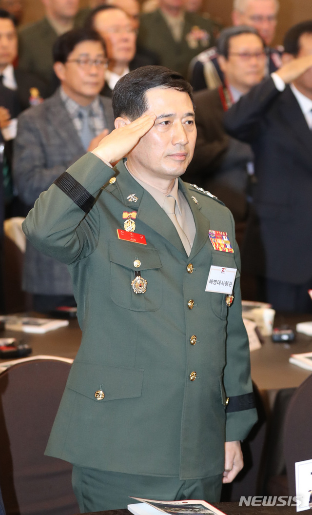 【서울=뉴시스】 전진환 기자 = 해병대 창설 70주년 해병대 발전 국제 심포지엄이 열린 2일 오전 서울 용산구 국방컨벤션센터에서 전진구 해병대 사령관과 안규백(앞줄 왼쪽) 국회 국방위원장 등 참석자들이 국민의례를 하고 있다. 2019.04.02.