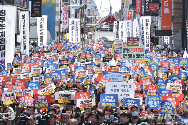 【포항=뉴시스】우종록 기자 = 11·15 포항지진 특별법 제정 촉구를 위한 ‘범시민 결의대회’가 열린 2일 오후 경북 포항시 북구 덕산동 육거리에서 시민들이 정부 배상을 촉구하며 피켓을 들고 구호를 외치고 있다. 2019.04.02.