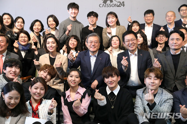 【인천=뉴시스】전신 기자 = 문재인 대통령이 2일 인천 연수구 솔찬공원에 위치한 복합문화공간 케이슨24를 방문해 한현옥 인천관광마케팅실장, 설민석 역사에듀테이너 등 참석자들과 토크콘서트를 마친 후 기념촬영을 하고 있다. 2019.04.02.