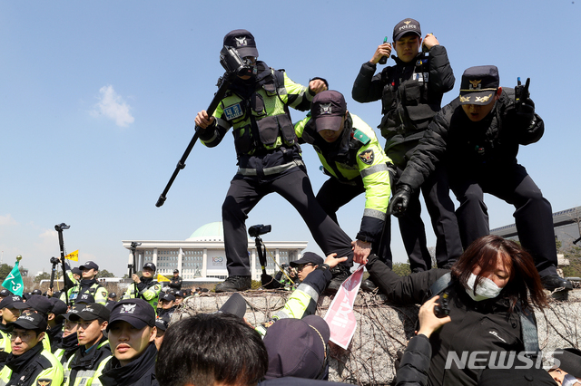 【서울=뉴시스】김병문 수습기자 = 민주노총이 3일 오전 서울 여의도 국회 정문에서 열린 '노동법 개정 정지 2차 총력투쟁'에서 국회 진입을 시도하고 있다. 2019.04.03.