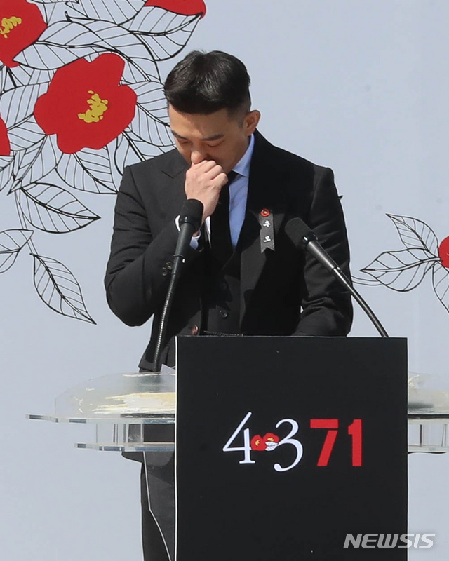 【제주=뉴시스】우장호 기자 = 배우 유아인(33)이 전국대표 6명과 3일 제주시 봉개동 제주4·3평화공원에서 열린 제71주년 4·3 추념식에서 현재와 미래를 위한 젊은 세대의 결의와 다짐을 하던 도중 눈물을 흘리고 있다. 2019.04.03.
