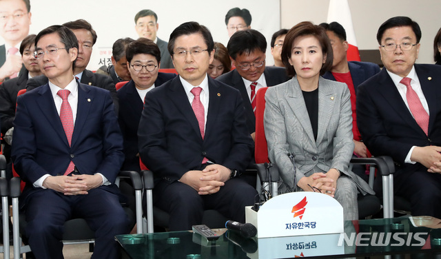 【서울=뉴시스】 박영태 기자 = 자유한국당 황교안 대표와 나경원 원내대표가 3일 오후 서울 영등포구 자유한국당 당사에서 4.3보궐선거 개표방송을 보고 있다. 2019.04.03.