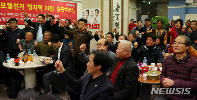【창원=뉴시스】추상철 기자 = 4.3 보궐선거가 실시된 3일 오후 경남 창원시 성산구 강기윤 후보 선거사무실에서 지지자들이 강기윤 후보를 연호하고 있다. 2019.04.03.