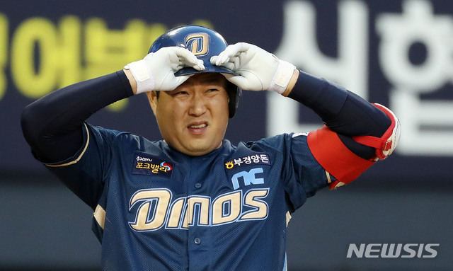 【서울=뉴시스】홍효식 기자 = 5일 서울 송파구 잠실야구장에서 열린 2019 프로야구 리그 두산 베어스와 NC 다이노스의 경기, 2회초 NC 양의지가 관중들에게 인사한 뒤 헬멧을 고쳐쓰고 있다. 2018.04.05.
