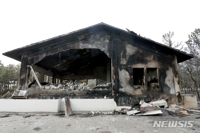 【동해=뉴시스】김병문 수습기자 = 강원 지역 화재 사흘 째인 6일 오전 강원 동해시 망상해수욕장에 위치한 오토캠핑장이 불에 타 무너져 있다. 2019.04.06.