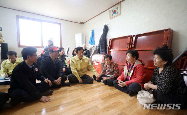 【강릉=뉴시스】김선웅 기자 = 진영 행정안전부 장관이 강원 고성·속초·강릉 지역 화재발생 사을 째인 6일 강원 강릉시 옥계면 천남리 경로당에서 주민들을 위로하고 있다. 2019.04.06.