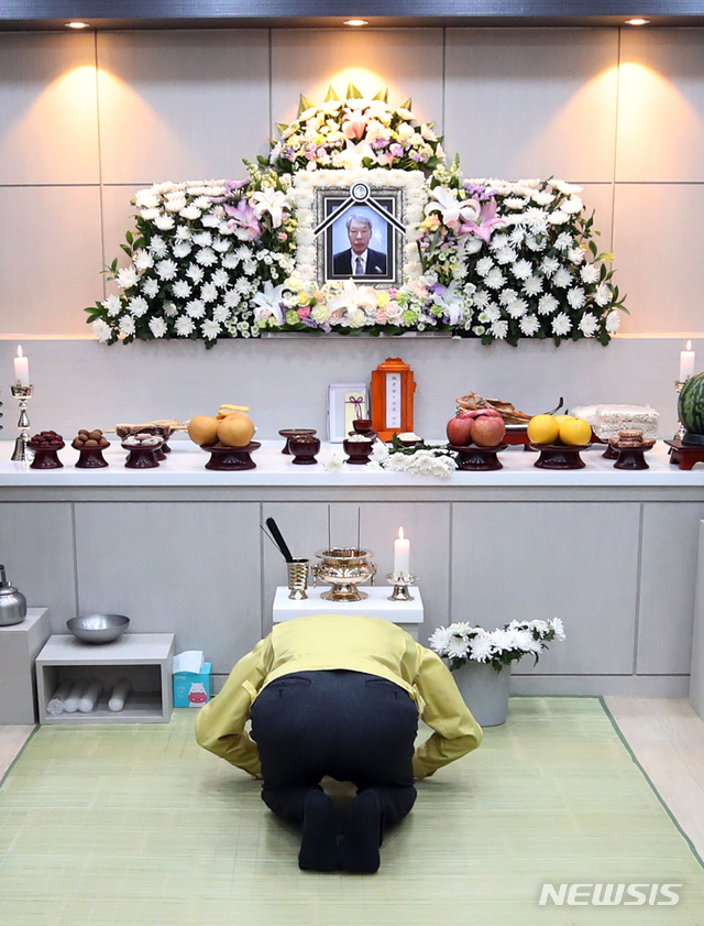 【속초=뉴시스】김병문 수습기자 = 강원 고성·속초 지역 화재 사흘 째인 6일 오전 진영 행정안전부 장관이 강원 속초시 보광장례식장에 마련된 화재 사망자의 빈소를 찾아 조문하고 있다. 2019.04.06.