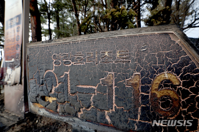 【속초=뉴시스】김병문 수습기자 = 강원 고성·속초 지역 화재 사흘 째인 6일 오후 강원 속초시 영랑호리조트의 안내판이 불에 타 있다. 2019.04.06.