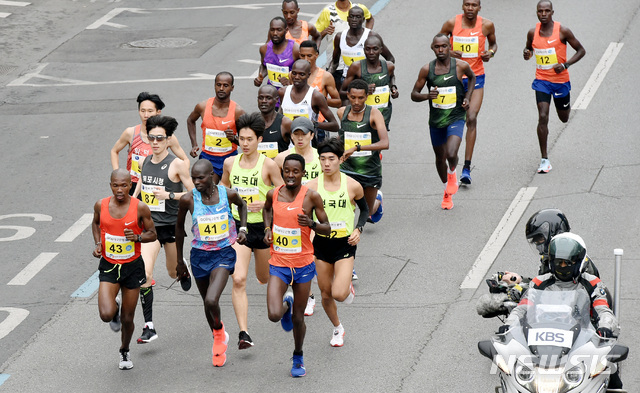 【대구=뉴시스】우종록 기자 = 2019년 대구국제마라톤대회가 열린 7일 오전 대구 중구 동인동 국채보상운동 기념공원에서 엘리트 풀 종목에 출전한 선수들이 마라톤 코스를 힘차게 달리고 있다. 2019.04.07.