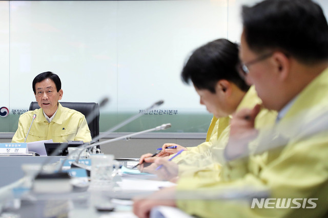 【서울=뉴시스】 진영 행정안전부 장관(중앙재난안전대책본부장)이 7일 오전 정부서울청사 중앙재난안전상황실에서 강원도 동해안 산불 지원 관련 관계부처와 함께 수습·복구대책 등에 대해 중대본 영상회의를 주재하고 있다. 2019.04.06. (사진=행정안전부  제공)