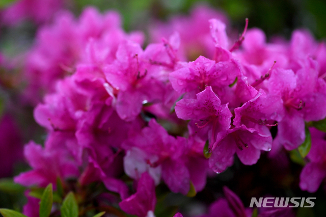 【남해=뉴시스】차용현 기자 = 7일 오후 경남 남해군 설천면 인근에서 반가운 봄비가 내리고 있는 가운데 활짝 꽃망울을 터뜨린 영산홍에 빗방울이 맺혀 있다. 2019.04.07.
