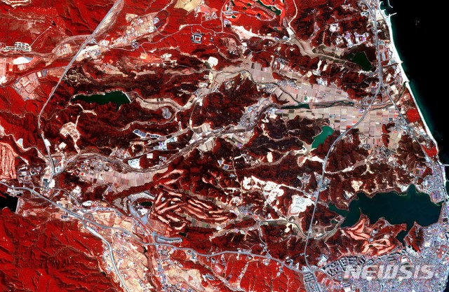 사진은 5일 13:00시에 위성카메라에 탑재된 센서가 근적외선과 가시광선 영상을 합성한 이미지로 붉게 표시된 부분은 화재가 난 지역을 표시한 것이 아니라 살아 있는 수풀 등 식생을 나타내는 것이라고 항우연은 밝혔다. 2019.04.07. (사진=한국항공우주연구원 제공)