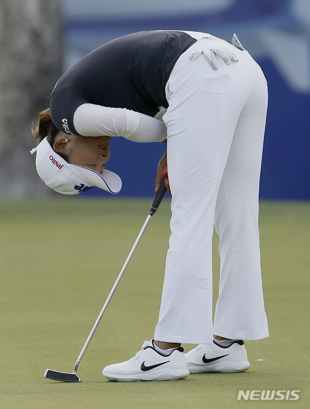 【랜초미라지=AP/뉴시스】고진영이 7일(현지시간) 미 캘리포니아주 랜초 미라지의 미션 힐스 CC에서 열린 미 여자프로골프(LPGA) 투어 ANA 인스퍼레이션 마지막 홀에서 버디를 기록, 우승을 확정한 후 기뻐하고 있다.