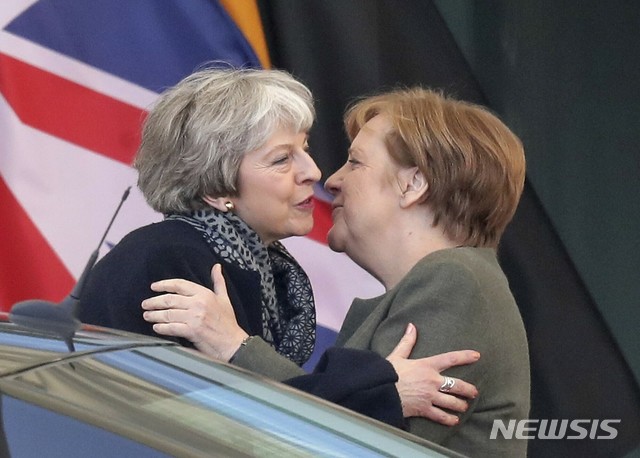 【베를린(독일)=AP/뉴시스】앙겔라 메르켈 독일 총리(오른쪽)와 테리사 메이 영국 총리가 9일 독일 베를린에서 회담 후 서로 포옹하고 있다. 영국 총리실은 이날 두 정상이 질서있는 브렉시트의 중요성에 대해 합의했다고 밝혔다. 2019.4.9