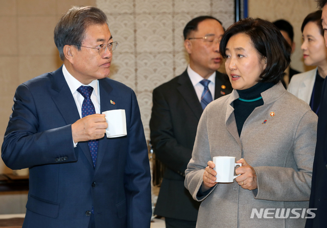 【서울=뉴시스】박진희 기자 = 문재인 대통령이 9일 청와대 본관에서 열린 국무회의에 앞서 박영선 신임 중소벤처기업부 장관과 차담을 나누고 있다. 2019.04.09.