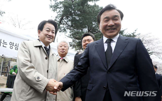 【서울=뉴시스】추상철 기자 = 손학규 바른미래당 대표와 정동영 민주평화당 대표가 9일 오전 서울 동작구 국립서울현충원에서 고 김대중 전 대통령 묘소 참배 전 인사를 나누고 있다. 2019.04.09.