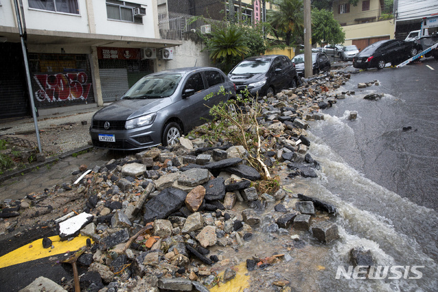 【리우데자네이루=AP/뉴시스】9일(현지시간) 브라질 리우데자네이루 일대에 극심한 폭우가 쏟아져 곳곳 도로가 파손돼 있다.