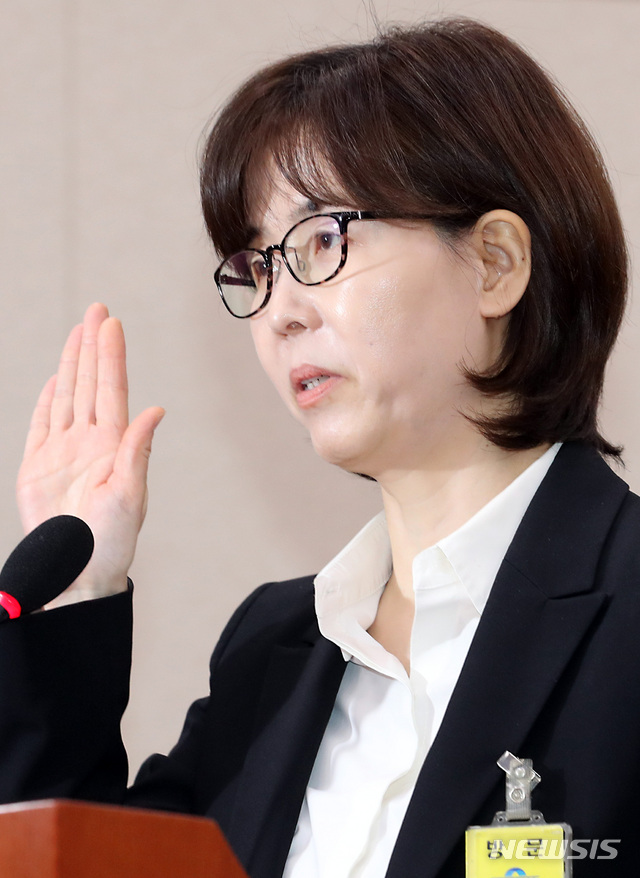 【서울=뉴시스】이종철 기자 = 이미선 헌재 재판관 후보자가 10일 서울 여의도 국회에서 열린 법제사법위원회 전체회의 인사청문회에서 선서를 하고 있다. 2019.04.10.
