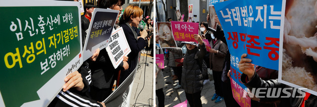 【서울=뉴시스】최동준 기자 = 헌법재판소가 낙태죄 처벌 위헌 여부를 밝히는 11일 서울 종로구 헌법재판소 앞에서 낙태죄 폐지와 유지를 주장하는 단체들이 각각 기자회견을 하고 있다. 2019.04.11.