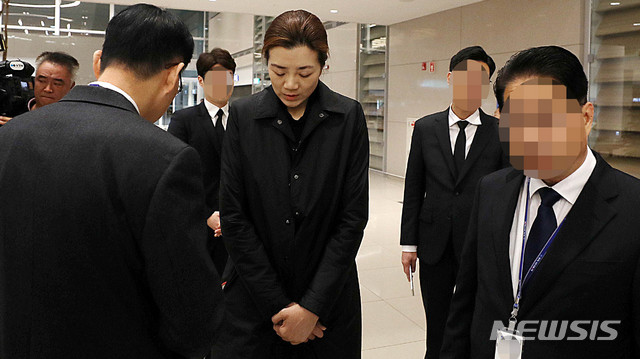 【인천공항=뉴시스】추상철 기자 =고 조양호 한진그룹 회장의 차녀 조현민 전 대한항공 전무가 12일 오전 고개숙인채 인천국제공항 제2여객터미널을 통해 귀국하고 있다.