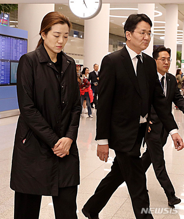 이들은 고 조양호 한진그룹 회장의 시신이 운구된 비행편으로 귀국했다. 2019.04.12.