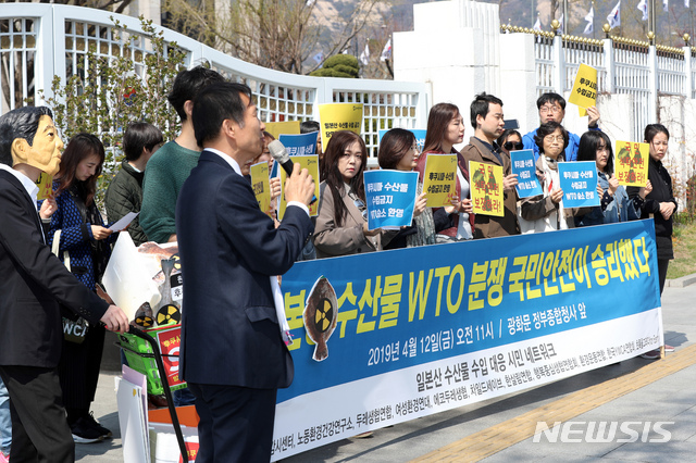 【서울=뉴시스】이윤청 수습기자 = 일본산 수산물 수입 대응 시민 네트워크가 12일 오전 서울 종로구 정부서울청사 앞에서 일본산 수산물 WTO 분쟁 승소 관련 기자회견을 열고 입장을 발표하고 있다.