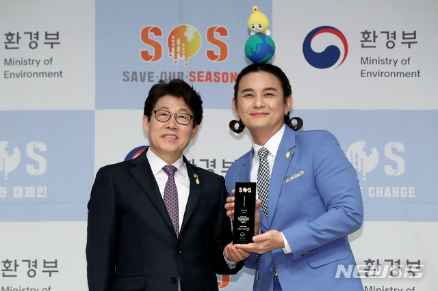 【서울=뉴시스】김병문 수습기자 = 조명래(왼쪽) 환경부 장관이 12일 오전 서울 중구 한국프레스센터에서 열린 '환경부 기후변화 홍보대사 위촉식'에 참석해 가수 노라조 조빈에게 위촉패를 전달하고 있다. 2019.04.12.