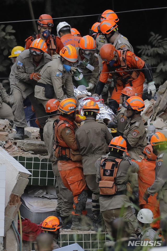 【리우데자네이루=AP/뉴시스】12일(현지시간) 브라질 리우데자네이루 서부 무제마에서 건물 2채가 무너져 구조대가 건물 잔해에서 구조한 부상자를 들것에 실어 옮기고 있다.