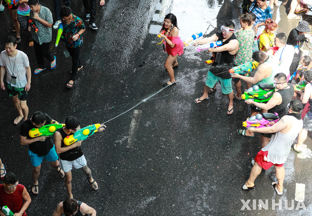 【방콕=신화/뉴시스】13일(현지시간) 태국 방콕의 시암 광장에서 연례 송크란 축제가 열려 참가자들이 즐겁게 물총 싸움을 하고 있다.