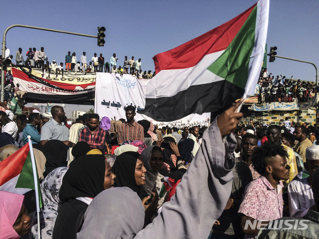 【카르툼(수단)=AP/뉴시스】13일(현지시간) 수단 수도 카르툼 육군본부 앞에서 수단 국기를 든 시위대가 민주주의로의 이양을 위한 문민정부 수립을 요구하며 행진하고 있다.