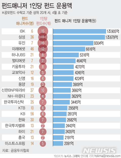 【서울=뉴시스】15일 금융투자협회에 따르면 4월초 기준 IBK자산운용의 펀드매니저 1인당 공모펀드 설정액은 1조905억원이다. 삼성자산운용은 한 명당 1조679억원을 관리했다.(그래픽=안지혜 기자)