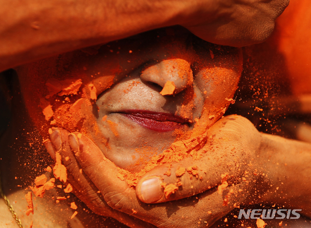 【박타푸르(네팔)=AP/뉴시스】15일(현지시간) 네팔 박타푸르에서 신두르 자트라 축제가 열려 한 참가자가 한 여성의 얼굴에 주황색 가루, 신두르를 문질러 바르고 있다.