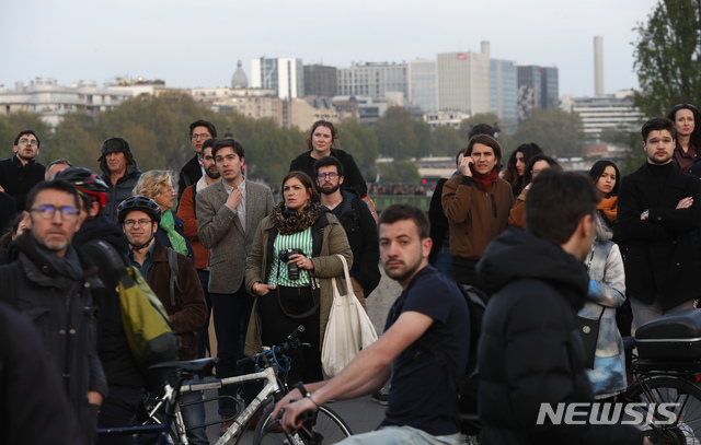 【파리=AP/뉴시스】15일(현지시간) 프랑스 파리 노트르담 대성당에서 대형 화재가 발생한 가운데 시민들과 관광객들이 망연자실한 표정을 짓고 있다. 이날 화재는 오후 6시50분께 발생했다. 2019.04.16