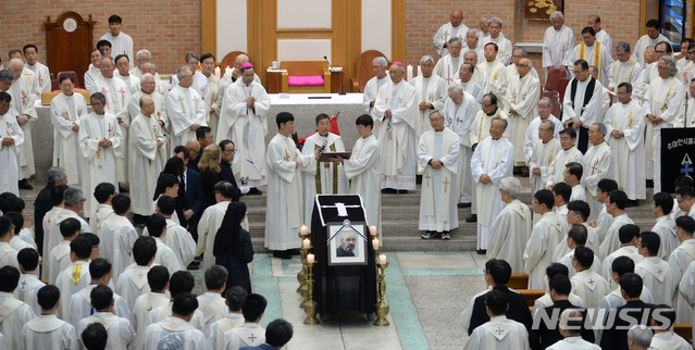 【전주=뉴시스】 김얼 기자= 故 지정환 신부의 장례미사가 16일 전북 전주시 전주 중앙성당에서 실시된 가운데 신부와 신자들이 고별식을 하며 지정환 신부를 보내고 있다. 2019.04.16.