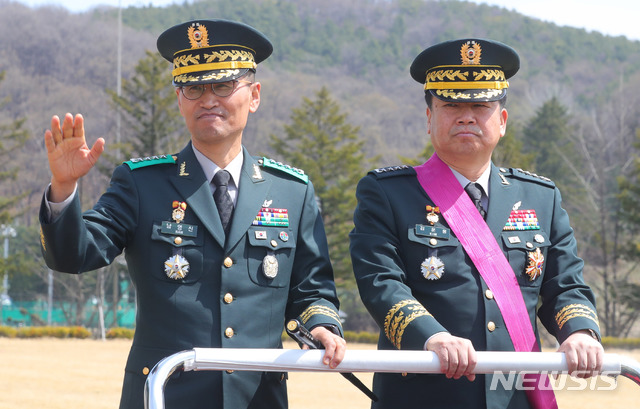 【용인=뉴시스】배훈식 기자 = 남영신 신임 지상작전사령관이 16일 오전 경기 용인시 지상작전사령부 대연병장에서 열린 취임식에 참석, 부대 열병을 하며 손을 흔들고 있다. 오른쪽은 김운용 전임 사령관. 2019.04.16.