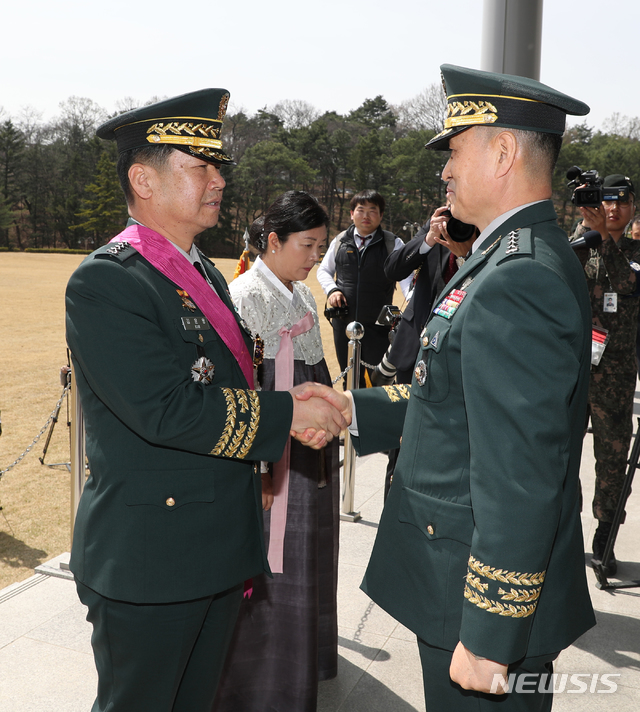 【용인=뉴시스】배훈식 기자 = 김용우(오른쪽) 육군참모총장이 16일 오전 경기 용인시 지상작전사령부 대연병장에서 열린 지상작전사령관 이취임식에 참석, 전역하는 김운용 대장에게 훈장을 수여하고 있다. 2019.04.16.